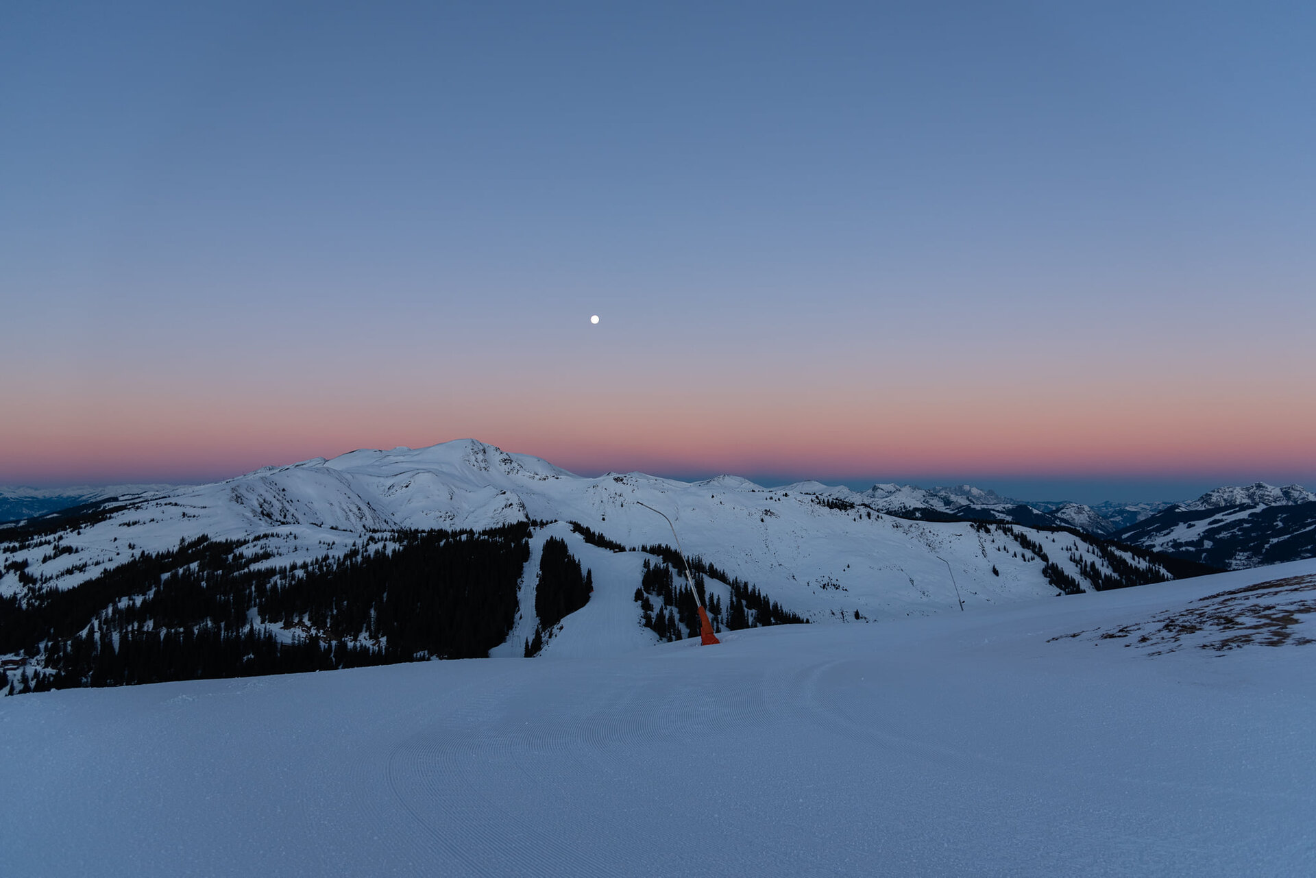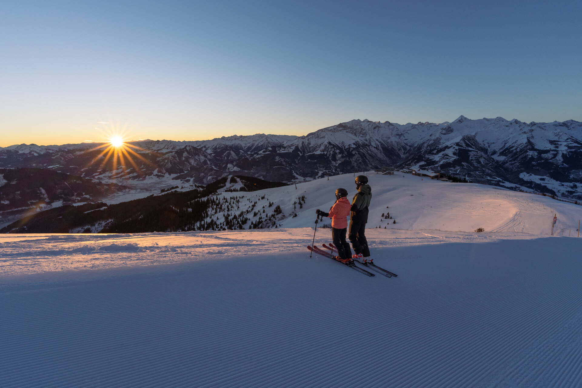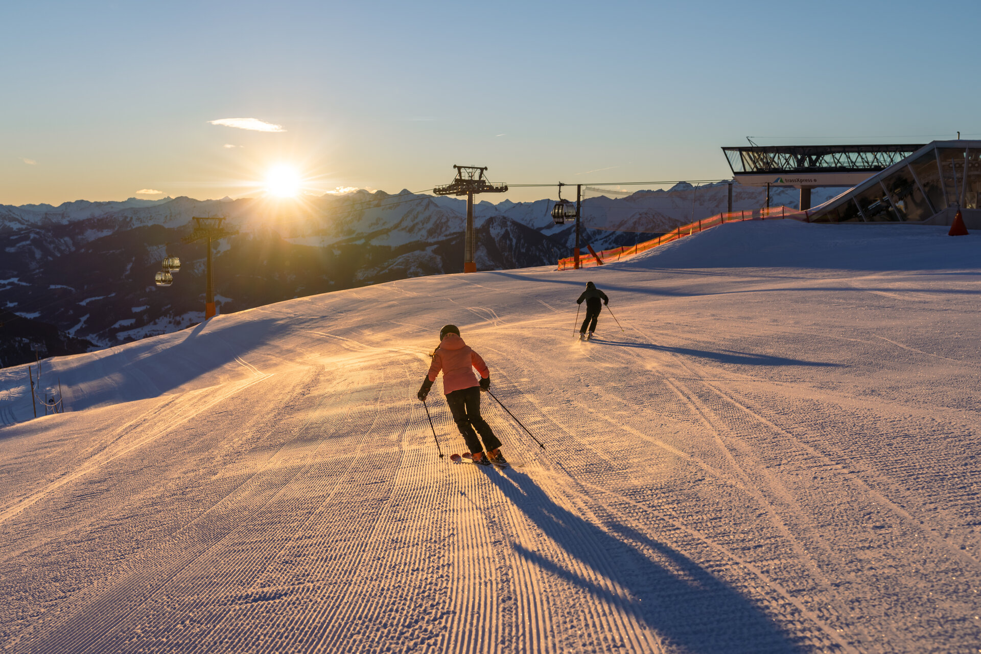 The sun slowly comes out from behind the mountain peaks: it's only seven o'clock in the morning, but the view is all the more beautiful for it! Perfectly groomed pistes lie untouched at our feet. And while the day is only just beginning in the valley, we are already enjoying our first turns and a spectacular sunrise in a wintry setting.